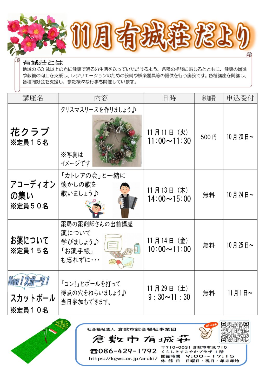 生きがいや健康づくりに関する各種講座を開講し、ふれあいの場・学びの場を提供しています。講座の内容や募集の状況については有城荘までお問い合わせ下さい。