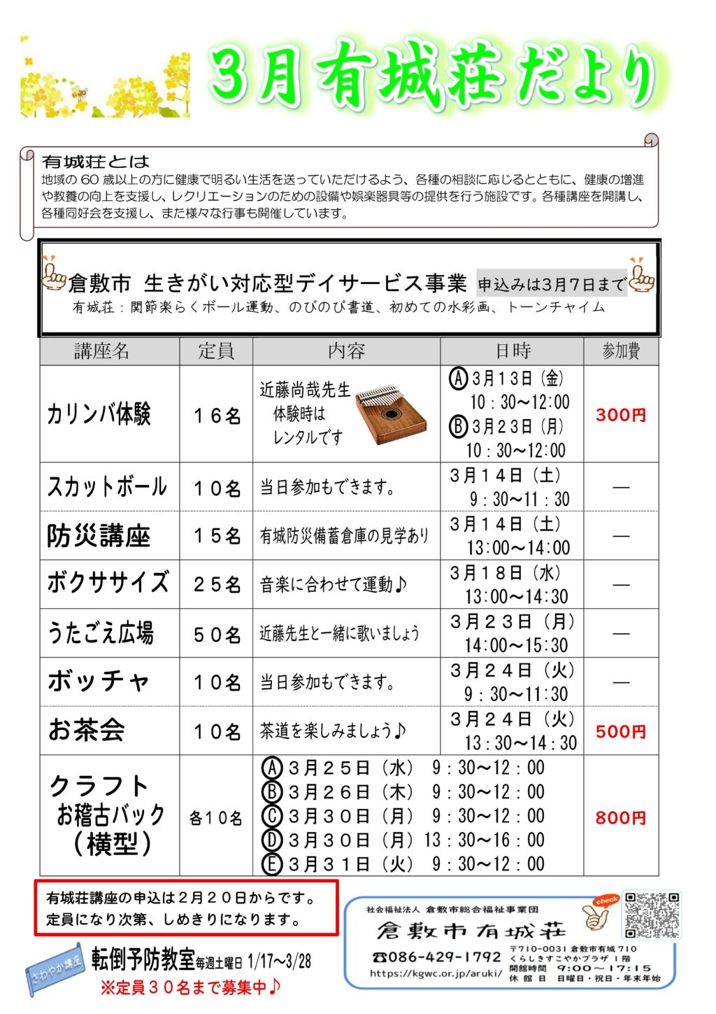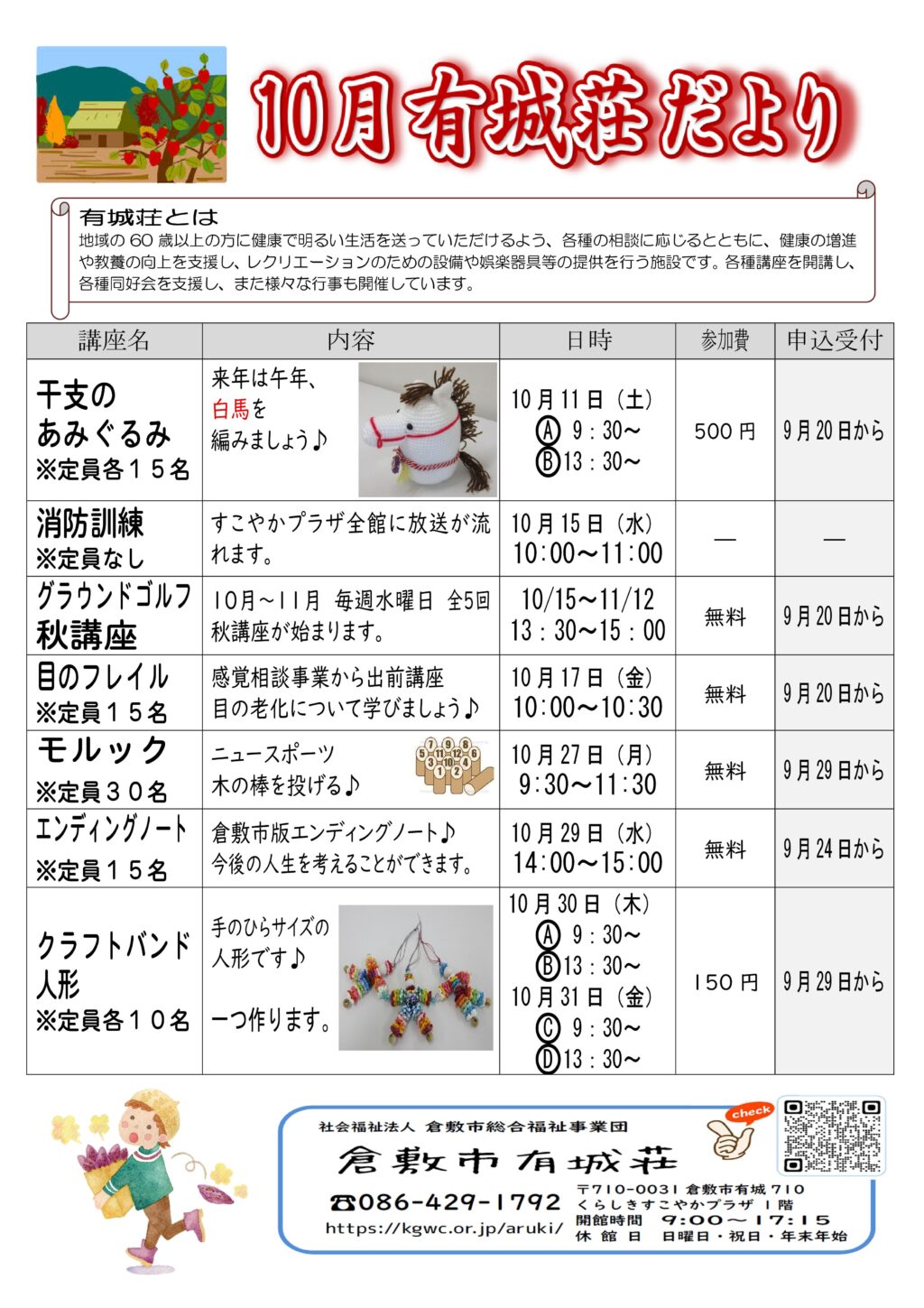 生きがいや健康づくりに関する各種講座を開講し、ふれあいの場・学びの場を提供しています。講座の内容や募集の状況については有城荘までお問い合わせ下さい。