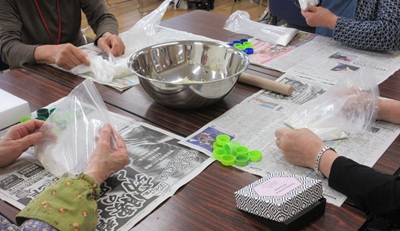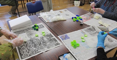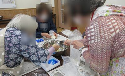 ごきぶりだんご 投稿日時: 2026年4月13日 投稿者: 有城荘 4月11日 3グループに分かれて 春の恒例行事になっている ごきぶりだんごを作りました。 ホウ酸、小麦粉、砂糖、玉ねぎ、牛乳を 袋の中でもみ合わせ、 ペットボトルのフタに詰めてできあがり。 テーブルごとで話も盛り上がっていました。