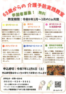 介護予防実践教室 認知症予防教室 講座生募集中(1月開始) 投稿日時: 2025年11月6日 投稿者: 介護予防事業 くらしき健康福祉プラザ・まびいきいきプラザ・柏島憩の家での教室ご案内 いつまでも心も体も元気で暮らしていくための取り組みとして、倉敷市在住で65歳以上の方を対象に転倒予防のためのストレッチや軽い筋力トレーニング、認知症予防の脳トレ、健康に関する講話など専門職が教室をご用意しております。 受講料は無料です。 好きなことや楽しみを見つけて、若々しく元気に毎日を過ごし、健康寿命を延ばしましょう。 各教室の詳細はこちら → 印刷用 各教室の日程・申込方法 → 印刷用