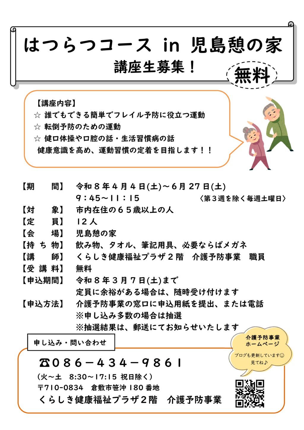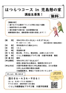 介護予防実践教室 in児島憩の家 講座生募集(4月開始) 投稿日時: 2026年2月19日 投稿者: 介護予防事業 児島憩の家での教室のご案内 いつまでも心も体も元気で暮らしていくための取り組みとして、転倒予防のためのストレッチや軽い筋力トレーニング、健康に関する講話などの教室を児島憩の家で開催します。 対象は倉敷市在住の65歳以上の方で、受講料は無料です。 好きなことや楽しみを見つけて、若々しく元気に毎日を過ごし、健康寿命を延ばしましょう。お気軽にお問合せください。 はつらつ in 児島憩の家→印刷用