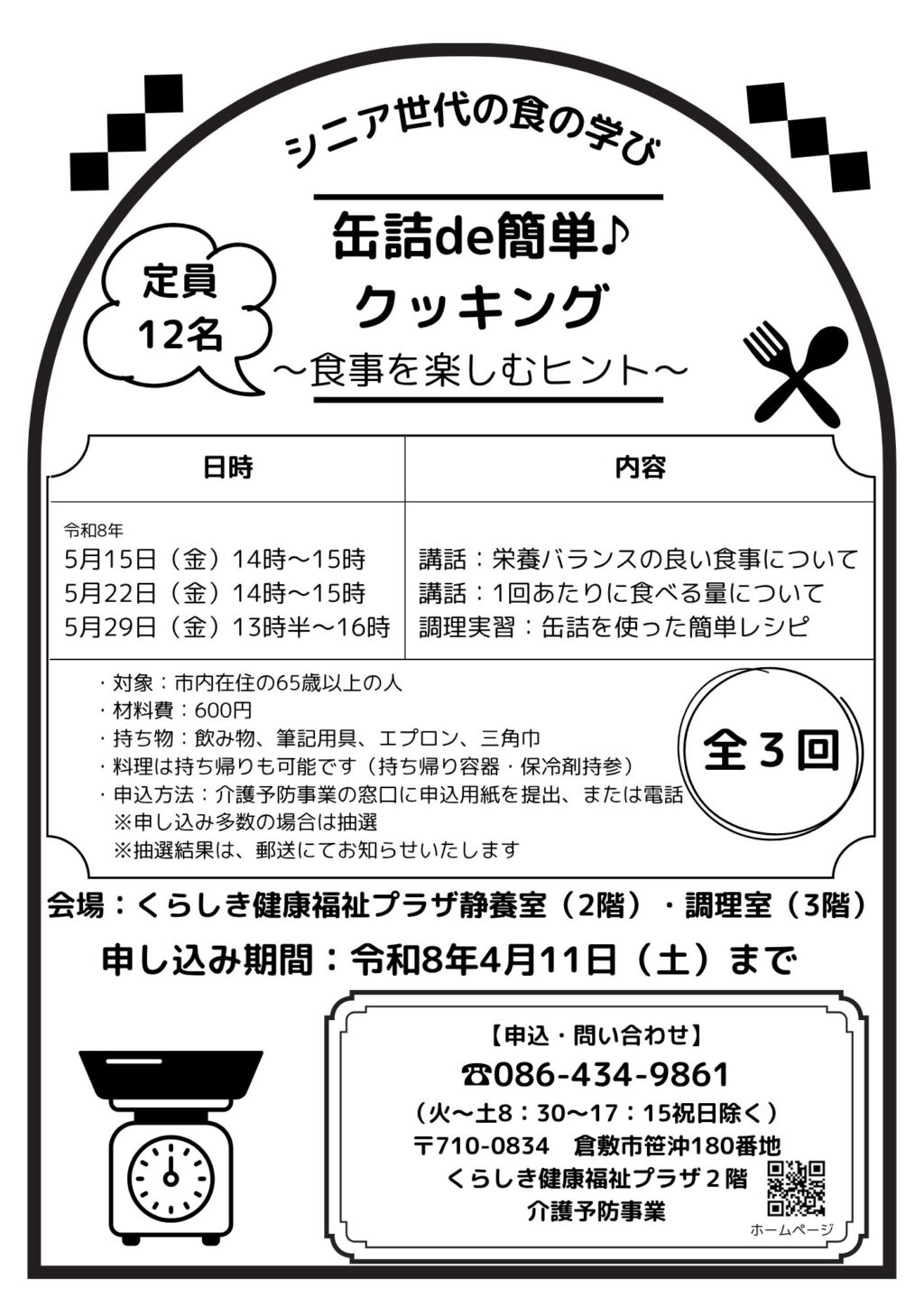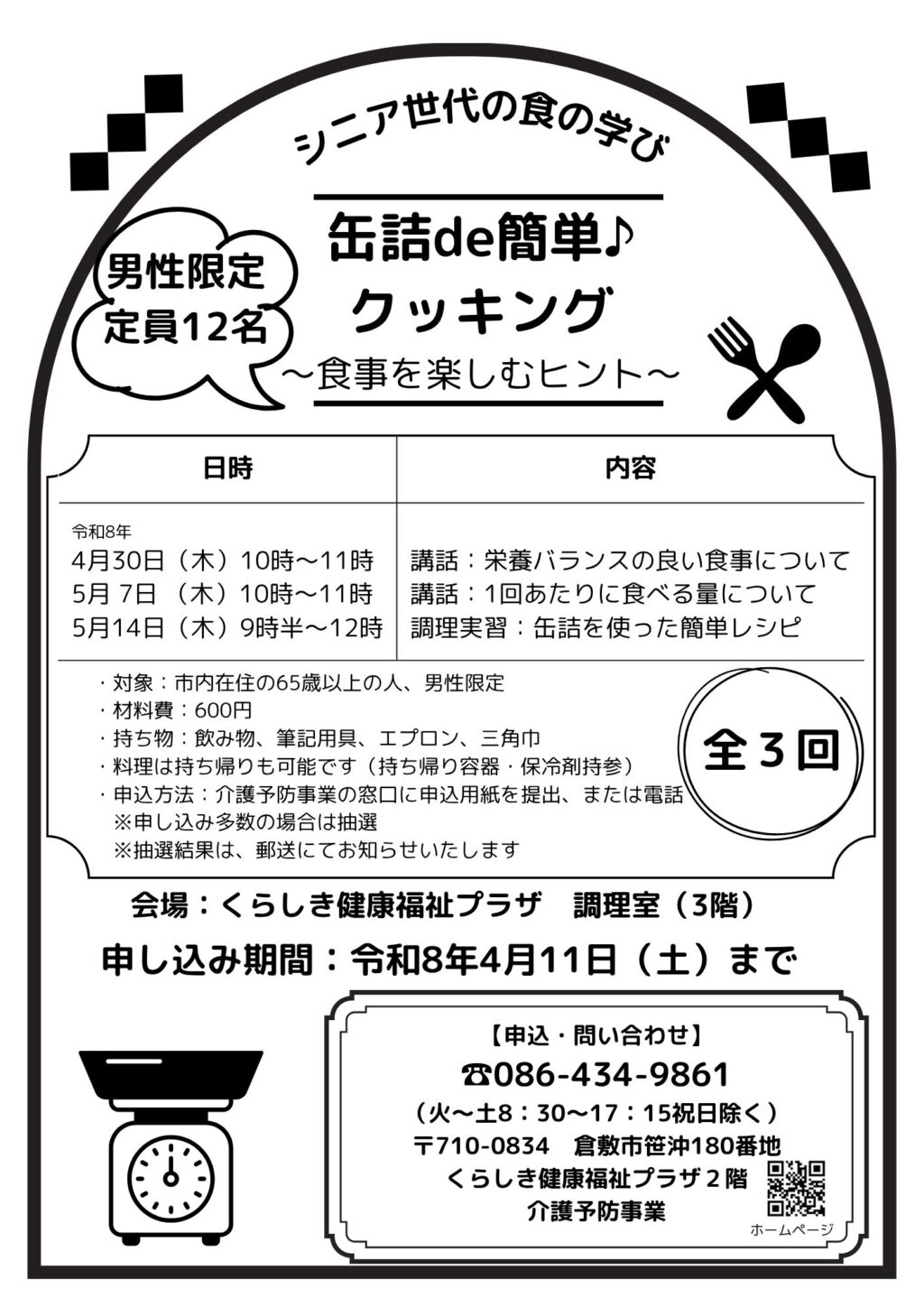 缶詰de簡単♪クッキング 参加者募集😃 投稿日時: 2026年3月27日 投稿者: 介護予防事業 くらしき健康福祉プラザで調理実習がある教室のご案内です。 栄養についての講話が2回、調理実習が1回の全3回の教室です。 材料費は600円で、料理は持ち帰りも可能です。 4月11日(土)が締め切りです。 男性限定の日程もあります。 栄養について学んで、食事を楽しみましょう 初めての方でもお気軽にお申込みください 印刷用はこちら(男性限定) → 栄養ちらし 印刷用はこちら → 栄養ちらし