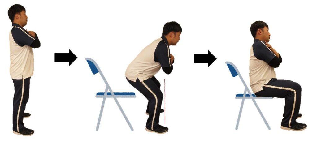 ②椅子に腰かけるように、体を前かがみにして、お尻を後ろに引きながら、