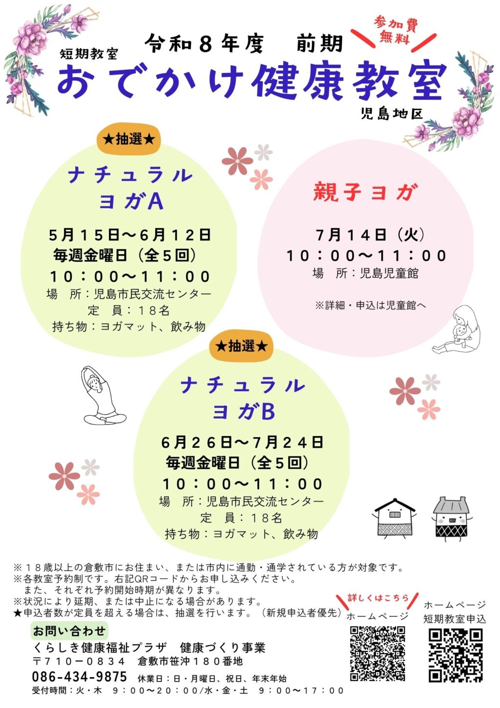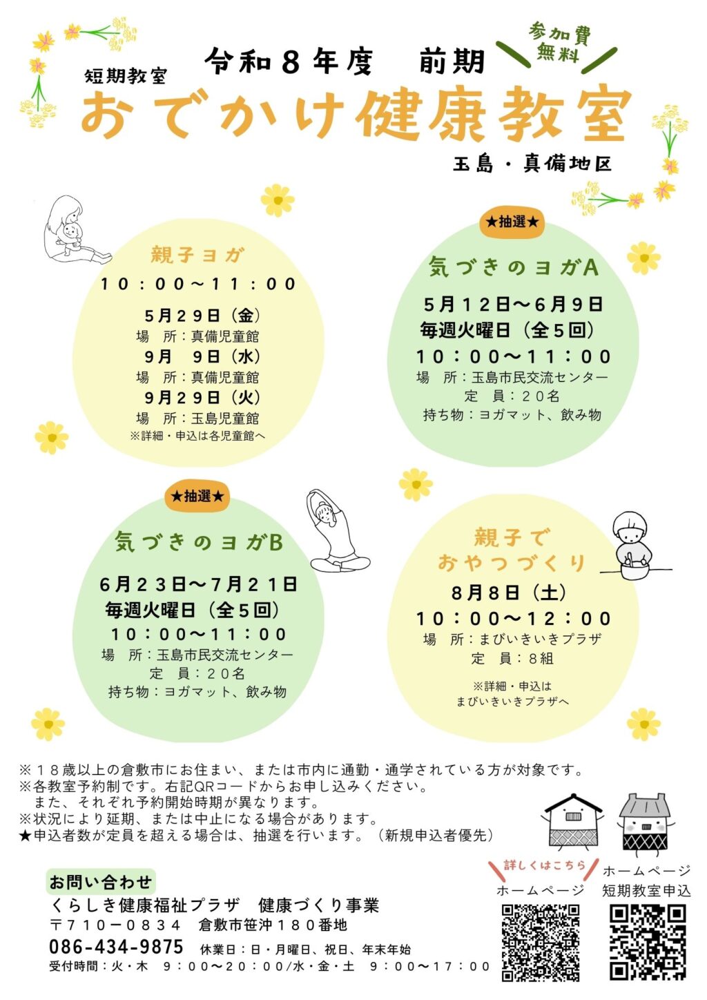 玉島市民交流センター、児島市民交流センター、ライフパーク倉敷で教室(無料)を