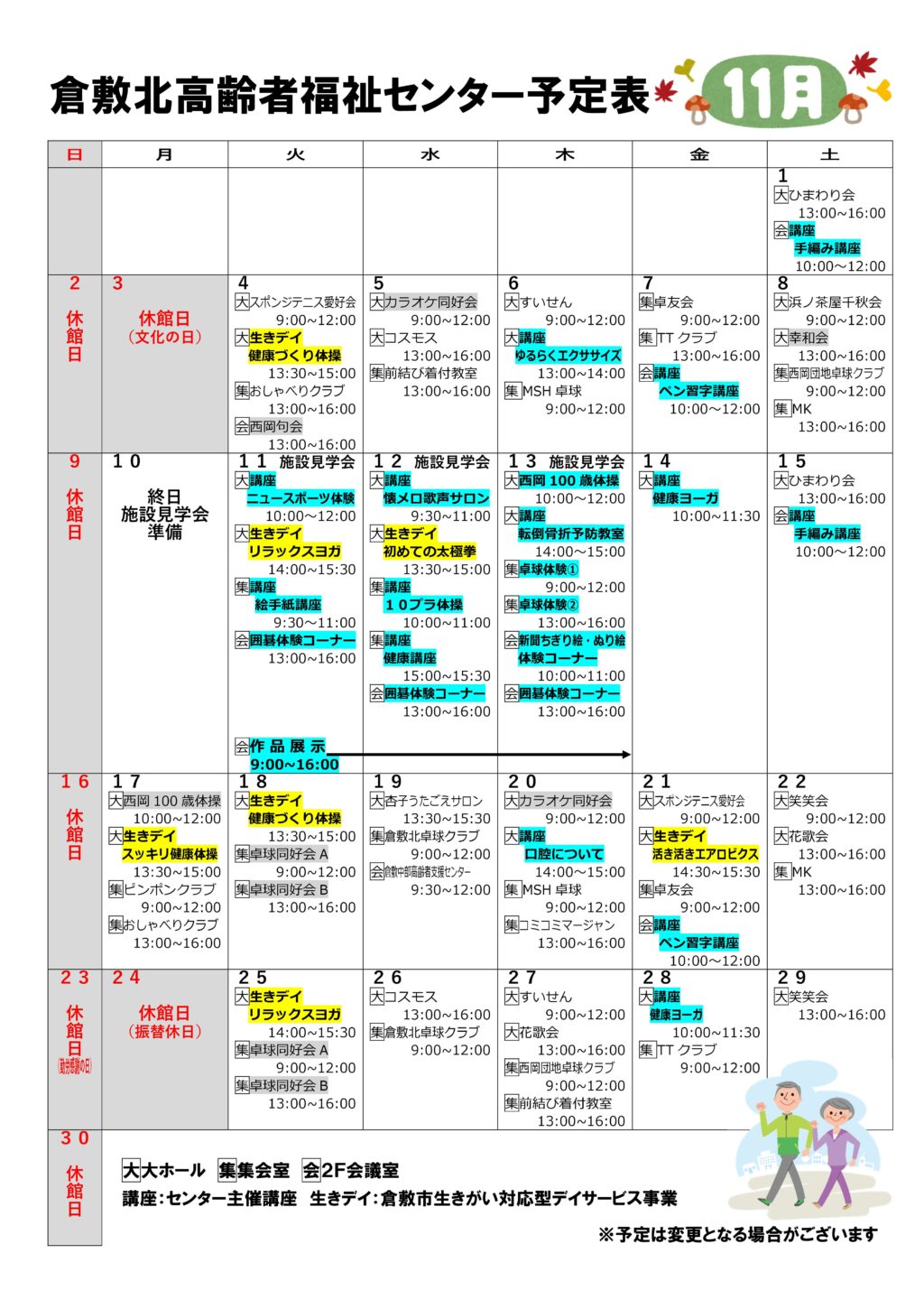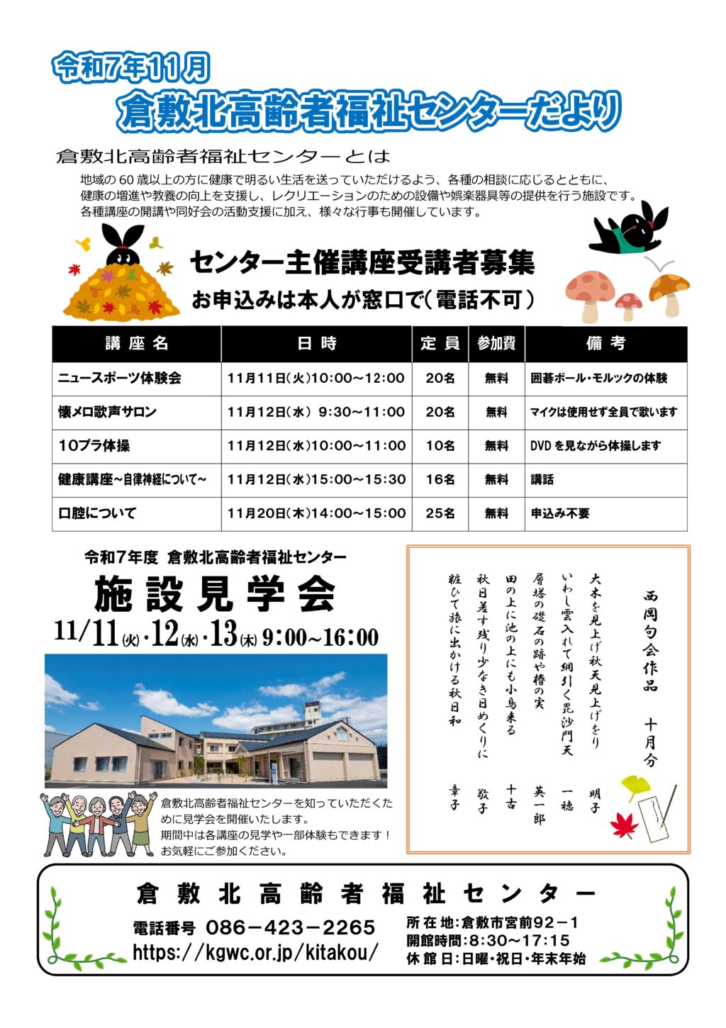 令和7年度 倉敷北高齢者福祉センター施設見学会のご案内 投稿日時: 2025年10月10日 投稿者: 倉敷北高齢者福祉センター令和7年11月11日火曜日・12日水曜日・13日木曜日の3日間 倉敷北高齢者福祉センターを知っていただくために施設見学会を開催いたします。 期間中は各講座の見学や一部体験もできます!お気軽にご参加ください。