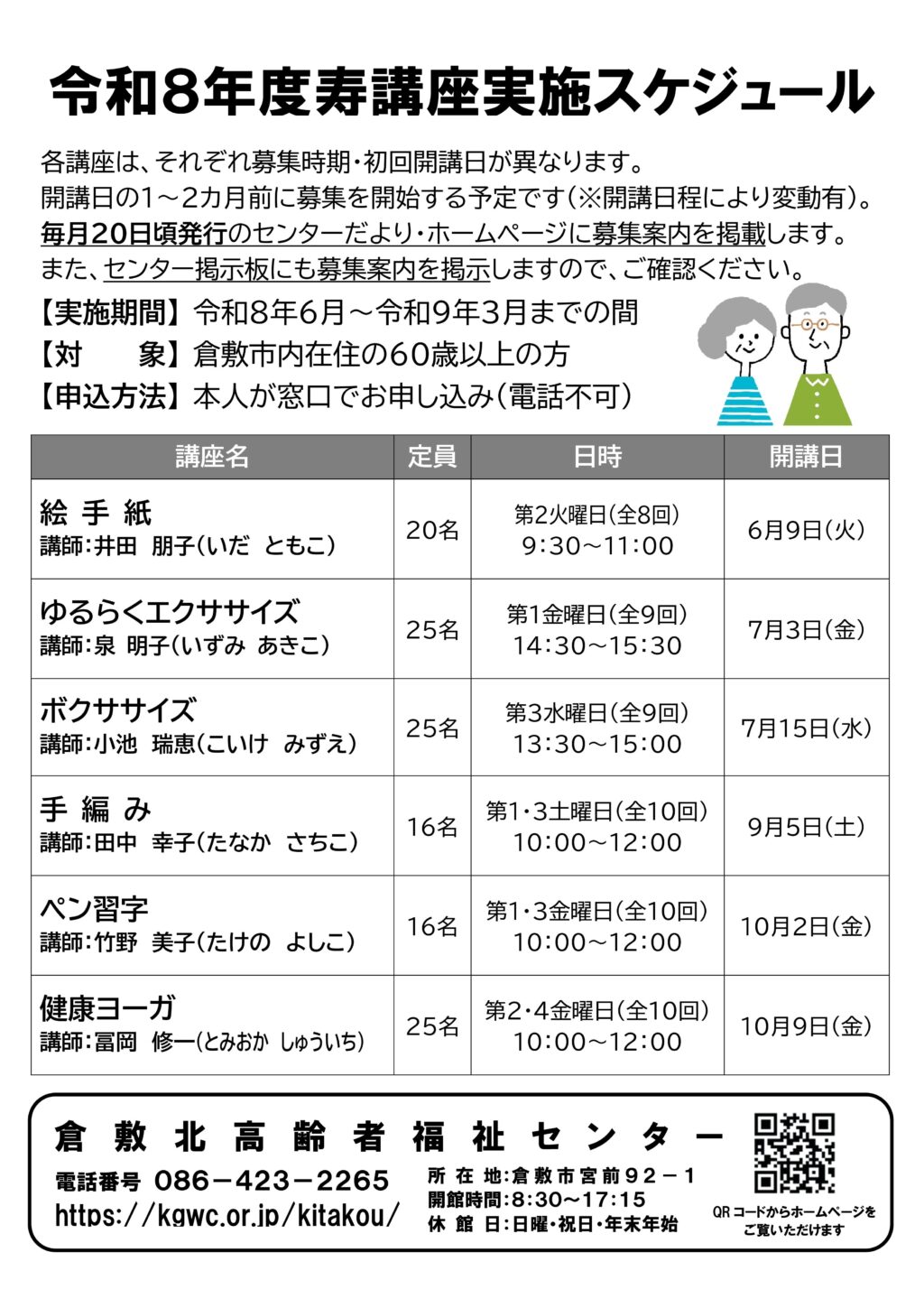 令和8年度 寿講座実施スケジュールのご案内 投稿日時: 2026年4月9日 投稿者: 倉敷北高齢者福祉センター令和8年度寿講座の実施が決定しましたのでご案内いたします。 R8年度寿講座実施スケジュール案内