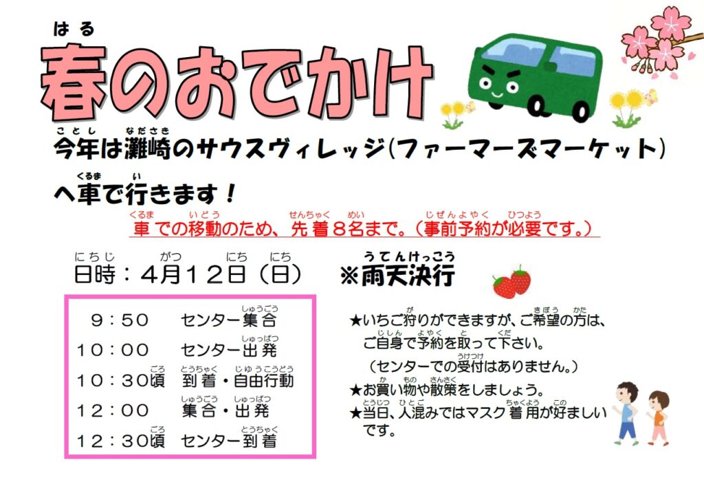 R8年度 おでかけ会 投稿日時: 2026年3月26日 投稿者: 児島はばたき だんだんと暖かくなり、気持ちの良い季節となりましたが いかがお過ごしでしょうか? さて、今年の春のおでかけは灘崎のサウスヴィレッジに行きます 園内を散歩するのもよし、お買い物を楽しむもよしです 車での外出なので、人数に制限があります ご希望の方はセンターにて申し込みください