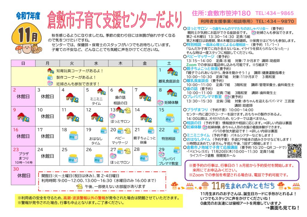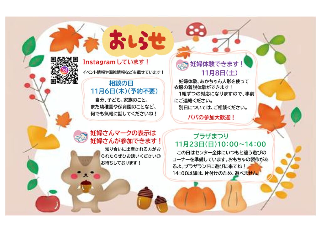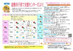 令和7年11月の予定表 投稿日時: 2025年10月15日 投稿者: 子育て支援センター 11月の予定表ができました。 戸外で遊ぶと気持ちよくなりましたね。 子育て支援センターにも遊びに来てくださいね。