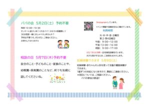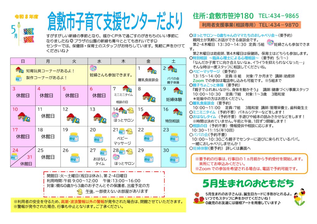 令和8年5月の行事予定表 投稿日時: 2026年4月15日 投稿者: 子育て支援センター 新年度もよろしくお願いします。 5月の予定表ができました。 草花も目に楽しい季節です。外でも楽しく遊びましょう♪