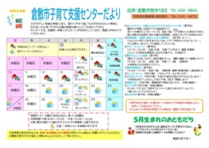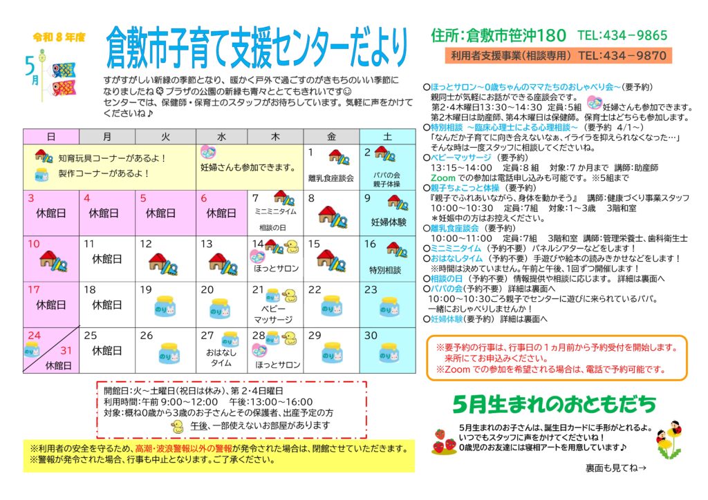 (訂正版)令和8年5月の行事予定表 投稿日時: 2026年4月18日 投稿者: 子育て支援センター 5月の行事予定表の訂正をしました。 「相談の日」✖10:30~11:15(年10回) 「相談の日」〇開所時間内にいつでもお待ちしています。 さわやかで、過ごしやすい季節になりました。 時には暑さを感じるほどですね。 5月も楽しく遊びましょう