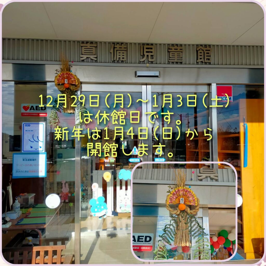 年末年始のお知らせ 投稿日時: 2025年12月27日 投稿者: 真備児童館 年末年始のお知らせです。 12月29日(月)~1月3日(土)は休館日です。 年始は1月4日(日)から開館します。 よろしくお願いします🙇 今年のお飾りは、小学生の『お飾りを作ろう』で小学生4人が協力して作ってくれました✨ とっても立派なお飾りができています。 遊びに来た時には、ぜひお飾りも見てみてください😊 みなさん、良いお年をお迎えください😊