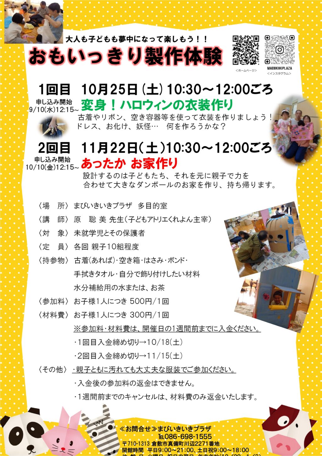 10月・11月開催 「おもいっきり製作体験」のお知らせ