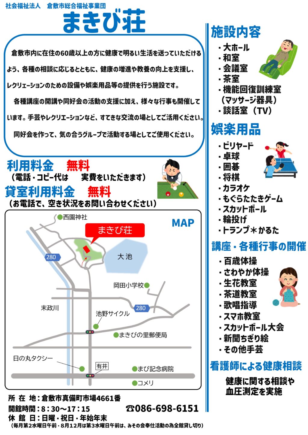 地域の60歳以上の方に健康で明るい生活を送っていただけるよう、各種の相談に応じるとともに、健康の増進や教養の向上を支援し、レクリェーションのための設備や娯楽器具等の提供を行う施設です。各種相談を開講し、各種同好会を支援し、また様々な行事も開催しています。