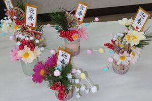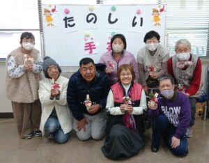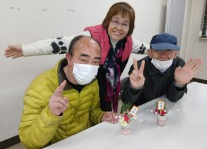 たのしい手芸を行いました。 投稿日時: 2025年12月28日 投稿者: 玉島はばたき 今回は爪楊枝とヤクルトの容器を使って、新年を迎える『ミニ門松』を作りました。ヤクルトの容器に爪楊枝を貼る作業は少し難しかったようですが、互いに助け合ったり、好みの飾りをつけて、それぞれにセンス溢れる作品ができあがりました。 次回も、手作りに興味がある方のご参加をお待ちしています😊