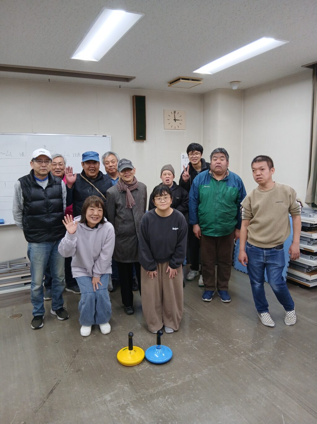 2月22日(日)『ユニカール』という、カーリングのようなニュースポーツを行いました。黄と青 の2チームに分かれ、みんなで作戦を考えながら点を競いました。